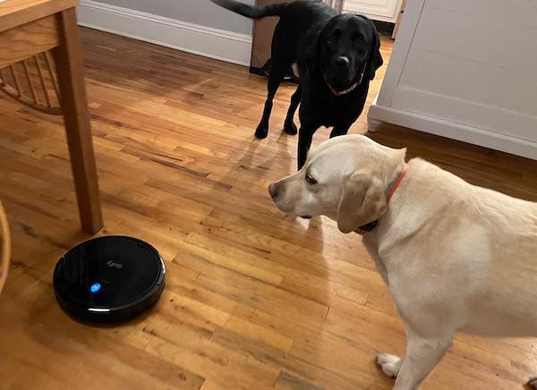 Example: The new eufy robot vac I bought on Black Friday Week is now part of the Cyber Monday Sale. I've only had it a few days, but so far it is going good. It is much quieter than my vintage Roomba robot vacs. It has a very low profile so it can clean under the white kitchen island - seen behind Andy & Spike in the pic above.